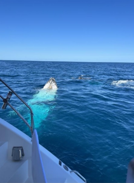 But that wasn’t all; they also witnessed the magic of the ocean as a playful dolphin joined a pod of humpback whales, a mother, and her calf. Staff were fortunate enough to capture stunning photos of their flukes as they danced in the waves. Additionally, staff noticed cookie-cutter shark bites on one of the whales, likely a female, highlighting the challenges these magnificent creatures face in their environment.